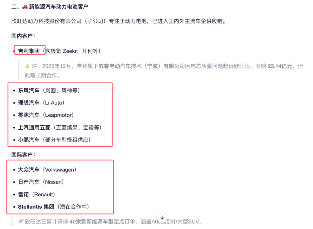 2、欣旺達于2025年7月提交港股IPO申請,翻閱其招股說明書可見,在介紹重要客戶時已無吉利身影,表述為:我們已成為領先的汽車OEM的重要動力類電池商,包栝理想、小鵬、零跑、廣汽、上汽、雷諾及日產等。如今突發(fā)這起重大訴訟,或打亂其港股IPO的進程。
