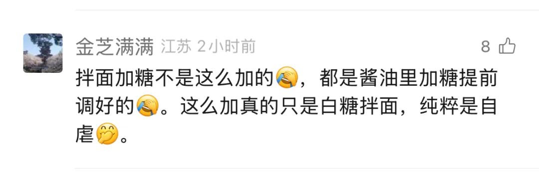 有細(xì)心的小伙伴留言指出,視頻中拌面直接加糖的方式不太符合無錫人的常規(guī)吃法。小布這就來解釋:@叨叨傅大量用白糖拌面的操作,其實是為了節(jié)目效果的夸張演繹,并非無錫人吃面的日常習(xí)慣哦~