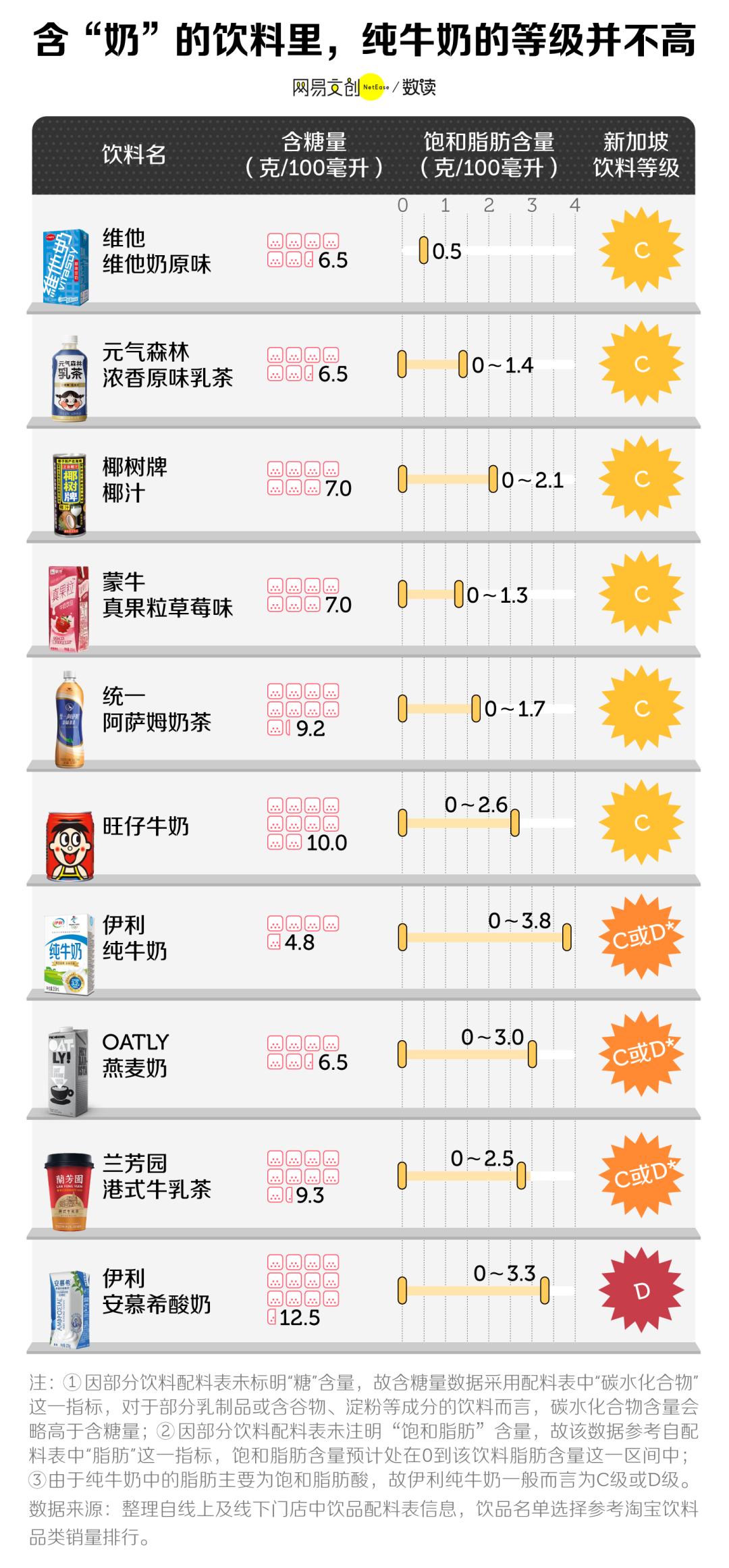 全脂牛奶因含有飽和脂肪,等級可能落到C級或D級,甚至不如齁甜的瓶裝奶茶。