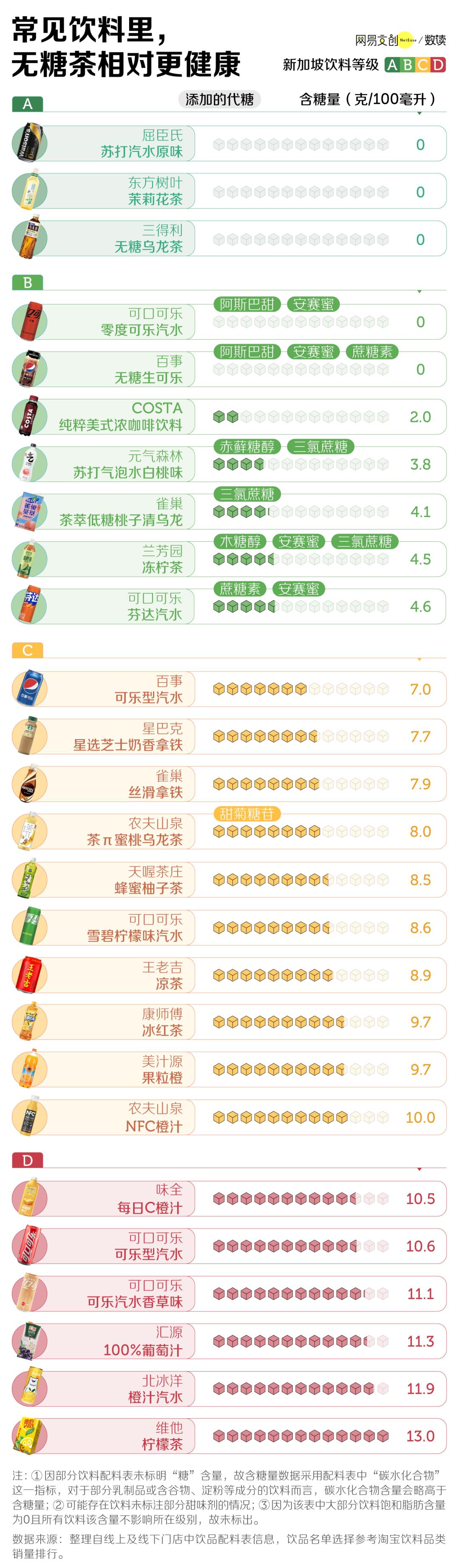 而普通速溶咖啡、含糖碳酸飲料、果汁、含糖茶飲等,大多會被評為C級或D級。