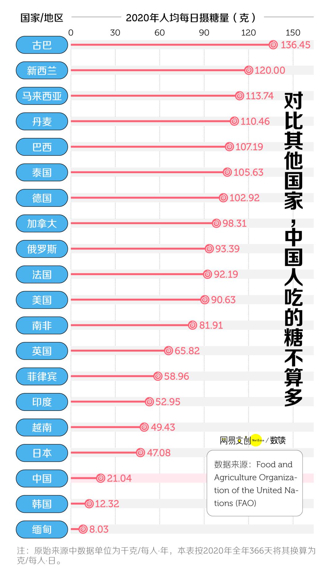 聯(lián)合國糧農(nóng)組織數(shù)據(jù)顯示,2020年中國人均每日攝糖量為21克,在全球排名靠后,許多國家的這一數(shù)字是中國的數(shù)倍,遠超世衛(wèi)建議量。