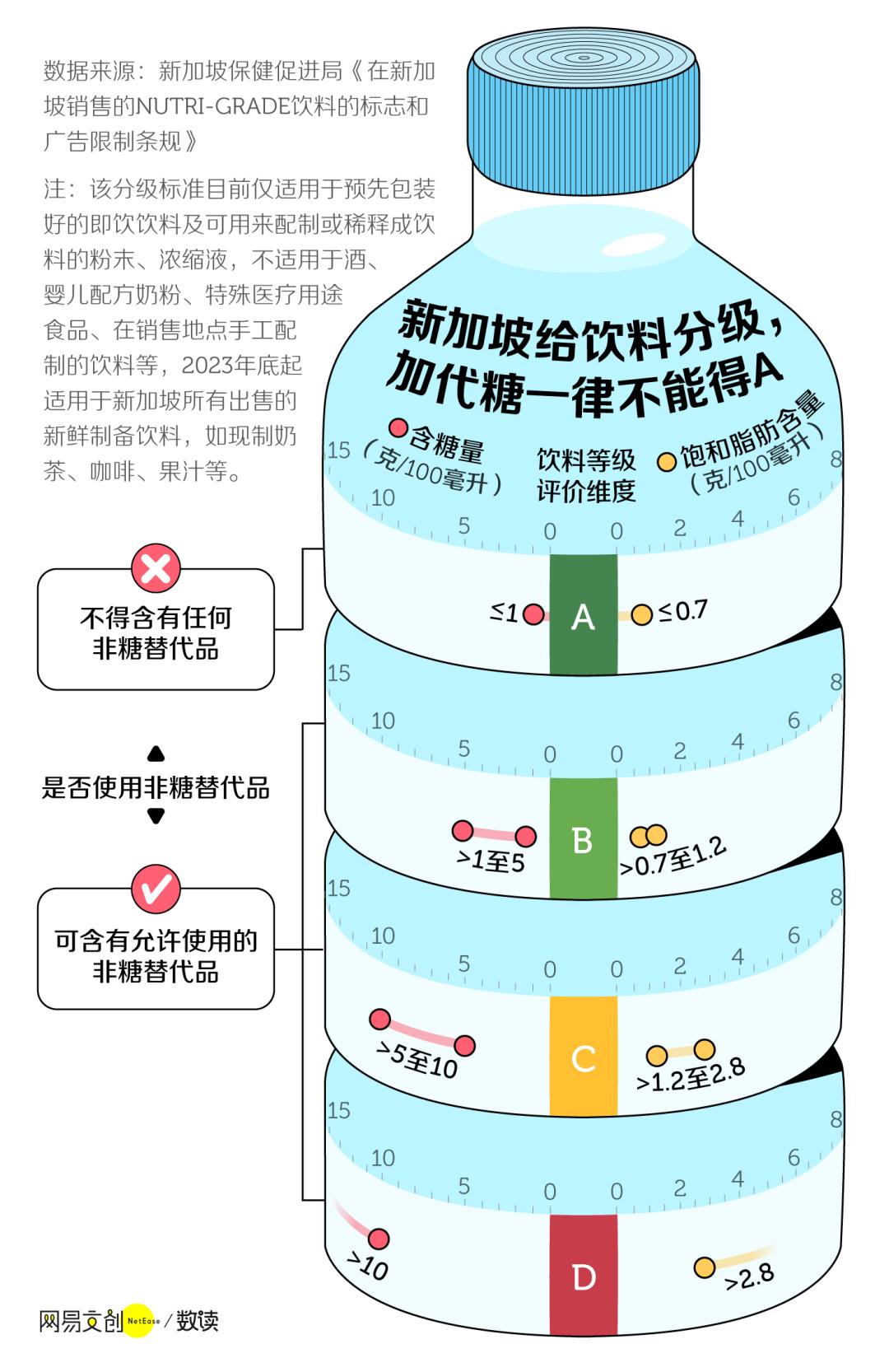 其實不止上海,早在2022年底,新加坡就實施了《食品條例(第2號修正案)》中的“史上最嚴”飲料分級制度,依據(jù)含糖量等指標(biāo)對包裝飲料進行等級劃分。