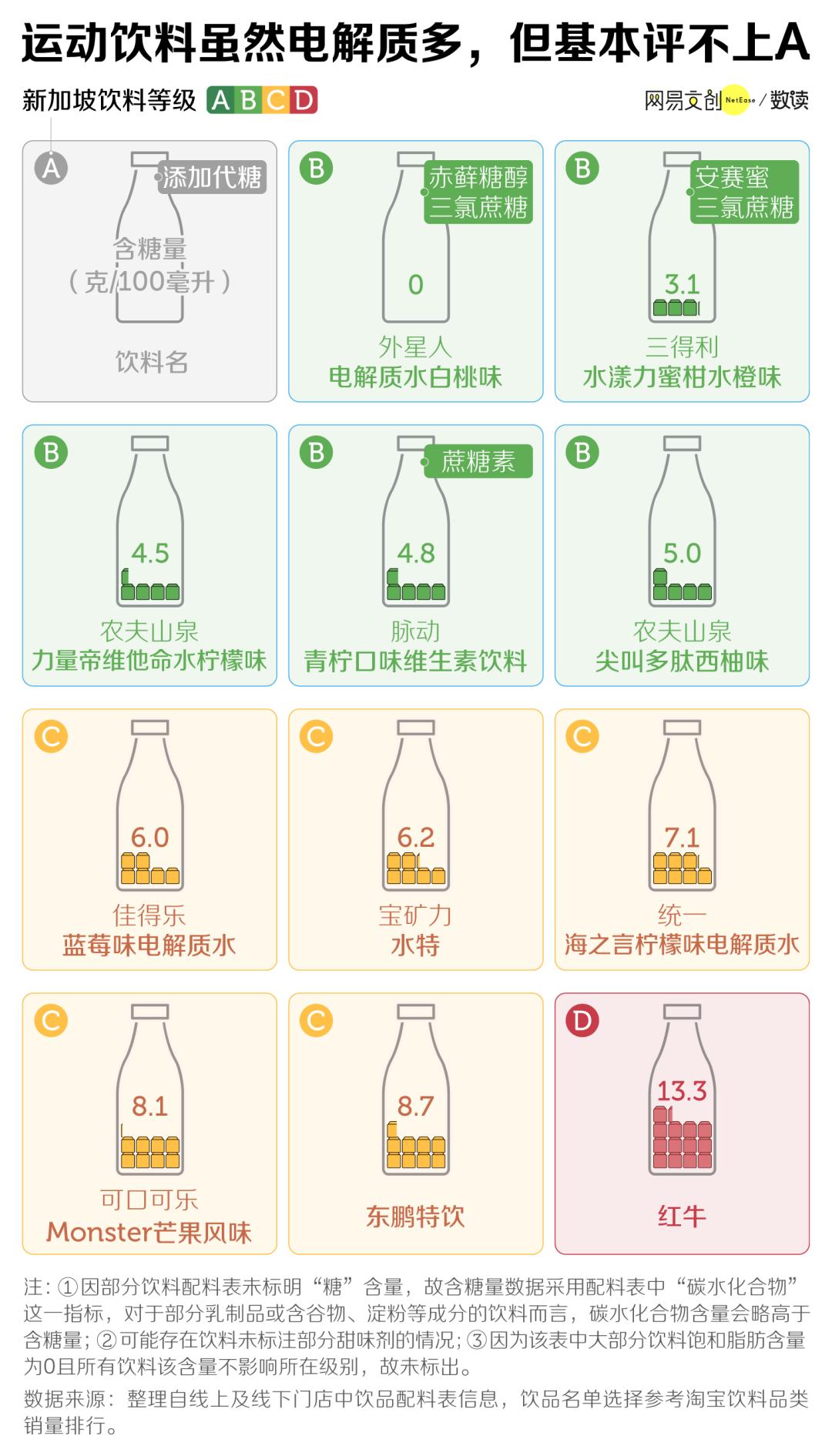 各類電解質(zhì)運動飲料也基本因含糖量高無法達到A級標(biāo)準(zhǔn)。