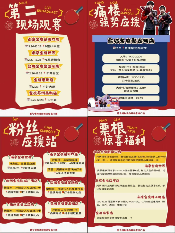 憑借全國門店網(wǎng)絡(luò)優(yōu)勢,金鷹圍繞乒超總決賽推出“乒超門票限量送”“乒超票根專屬權(quán)益”“乒超粉絲應(yīng)援站”“第二現(xiàn)場觀賽”“運(yùn)動員近距離互動”等多元化活動,全方位營造濃厚賽事氛圍,吸引廣大球迷與市民積極參與。各地門店特色活動亮點十足:鹽城金鷹聚龍湖店打造“莎頭”主題應(yīng)援痛樓,線上線下聯(lián)動點燃粉絲熱情;南京新街口店、淮北金鷹舉辦路人乒乓球爭霸賽,并設(shè)置第二現(xiàn)場觀賽專區(qū),讓消費者盡情感受乒乓競技的魅力;南京金鷹世界、徐州金鷹彭城廣場店、揚(yáng)州金鷹文昌店等多家門店同步開啟粉絲應(yīng)援打卡活動,掀起全城乒乓熱潮。