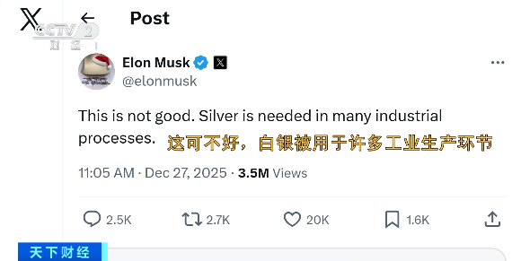 不過,也有分析人士認為,與以往由投機驅(qū)動的周期不同,本輪白銀漲勢的支撐因素更為多元。白銀不僅是貴金屬中相對親民的投資品,更在工業(yè)領(lǐng)域具有不可替代的作用,馬斯克也對此發(fā)表了看法。近期,他在社交平臺X上針對銀價上漲現(xiàn)象發(fā)文稱:“這可不是好事,白銀在眾多工業(yè)生產(chǎn)環(huán)節(jié)都有應(yīng)用?!?/p>