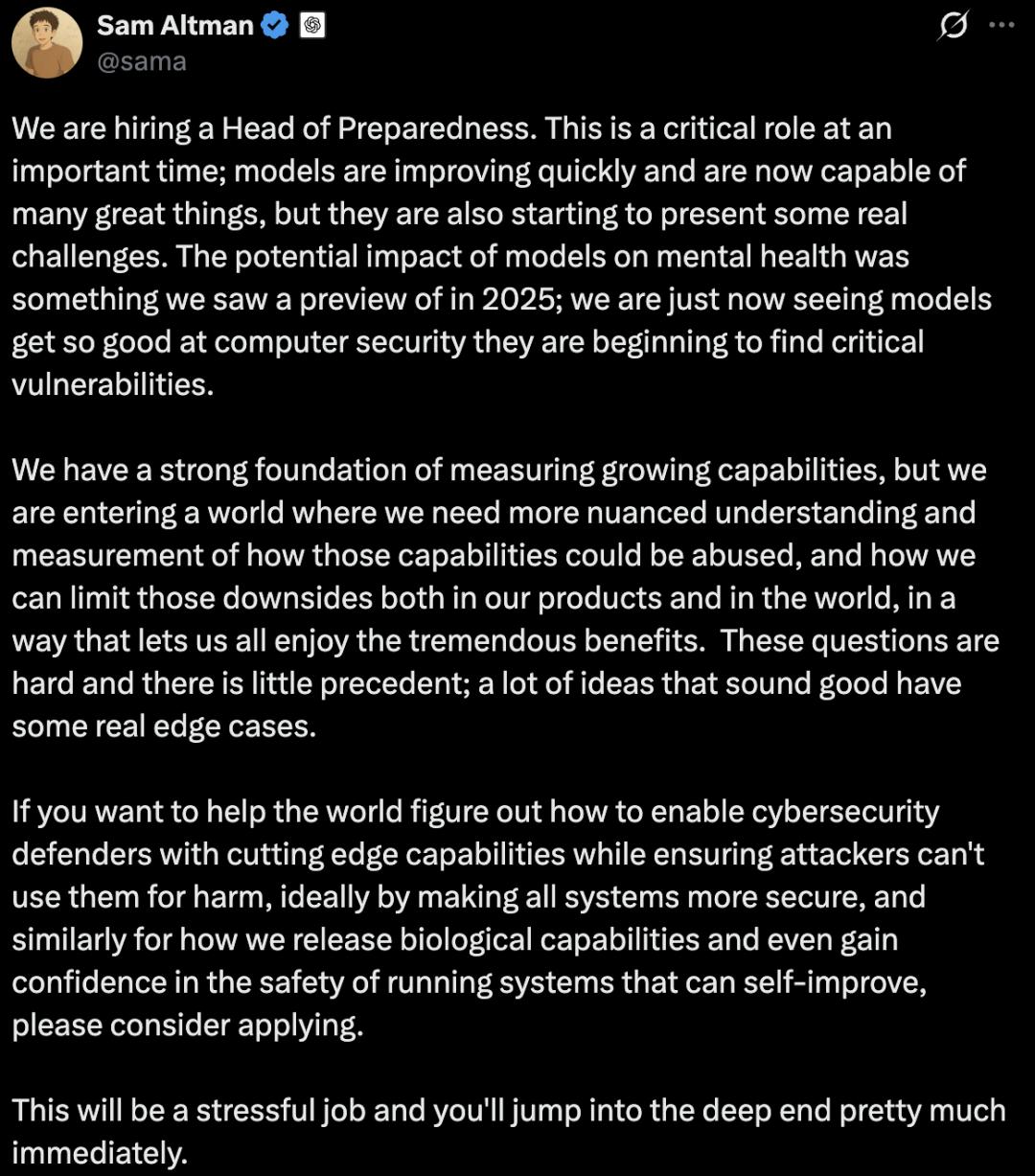 近日,奧特曼發(fā)布帖子,計劃為OpenAI招募一位「準(zhǔn)備工作負(fù)責(zé)人(Head of Preparedness)」。