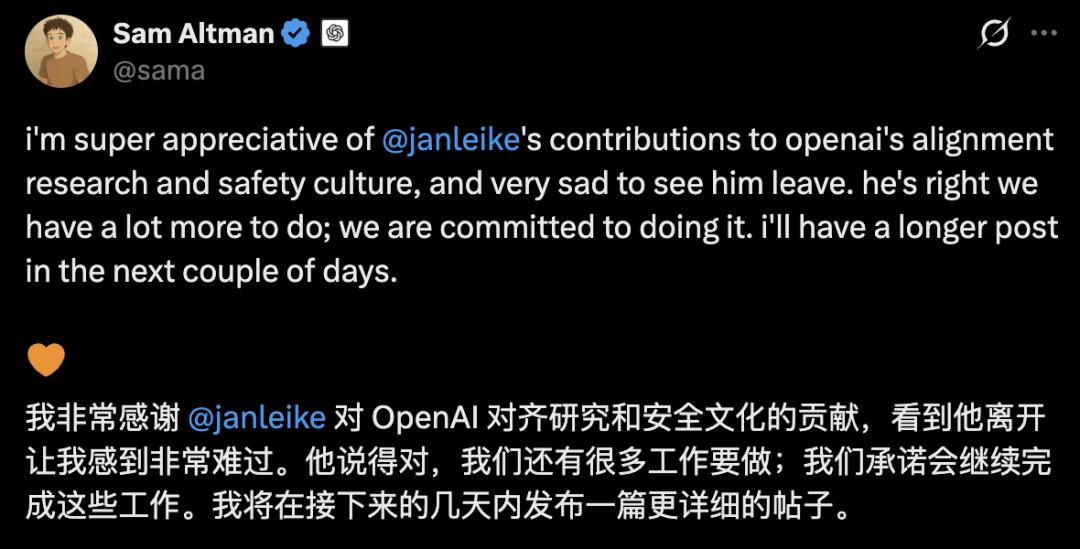 當(dāng)時奧特曼針對Leike的發(fā)帖回應(yīng)稱,他說得對:「我們還有很多事情要做;我們承諾會去做」。