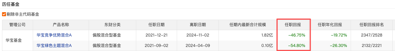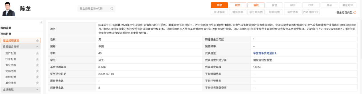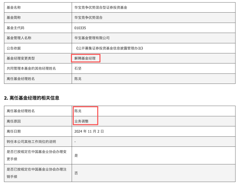 不過(guò),陳龍?jiān)?024年先后卸任了這兩只基金的基金經(jīng)理職務(wù)。2024年4月,華寶綠色主題混合基金因規(guī)模持續(xù)低于監(jiān)管要求而被清盤(pán),陳龍隨之卸任該基金經(jīng)理;同年11月2日,華寶競(jìng)爭(zhēng)優(yōu)勢(shì)混合基金發(fā)布公告解聘陳龍,公告中給出的離任理由為業(yè)務(wù)調(diào)整。