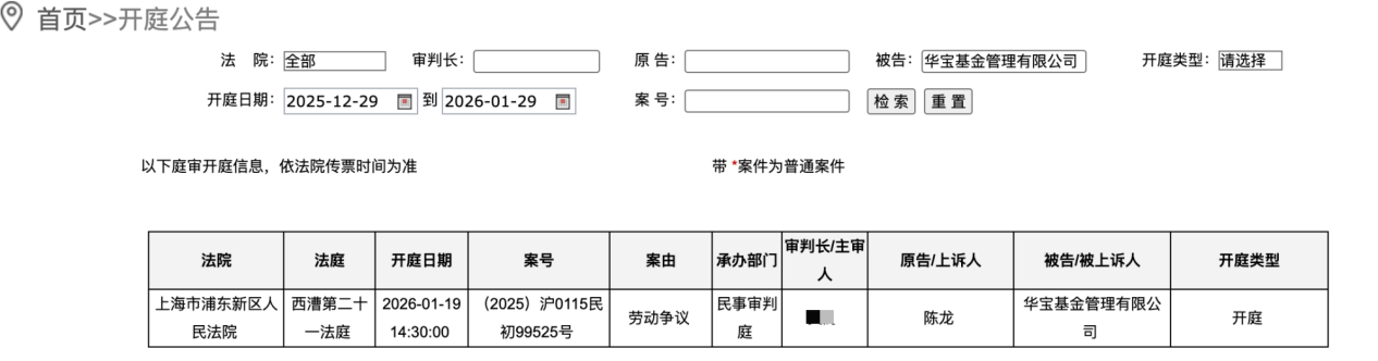 鳳凰網(wǎng)財(cái)經(jīng)訊 近日,華寶基金因一起勞動(dòng)糾紛案件成為被告,案件原告為陳龍,案由系勞動(dòng)爭(zhēng)議,該案件將于2026年1月19日在法院開(kāi)庭審理,相關(guān)開(kāi)庭信息可在上海市高級(jí)人民法院官網(wǎng)查詢(xún)到。