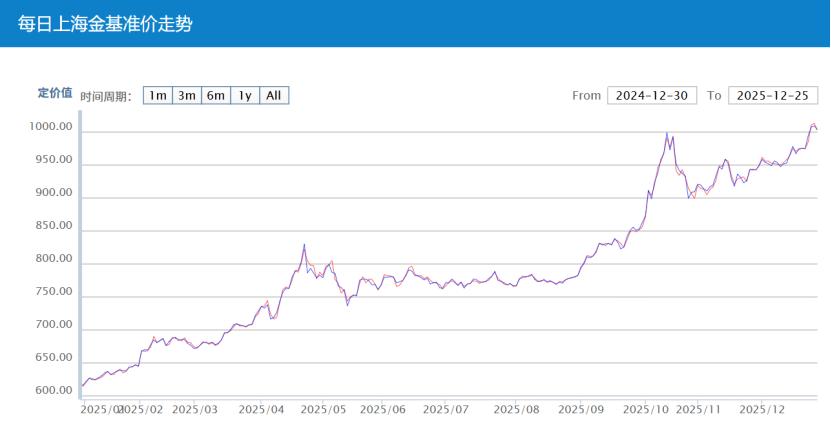 這個(gè)討論的背后,是黃金近乎無(wú)休止的漲價(jià)潮。2025年以來(lái),黃金價(jià)格一路飆升,年底前突破4500美元/盎司(約3.16萬(wàn)人民幣),創(chuàng)下歷史新高,年內(nèi)漲幅超70%。國(guó)內(nèi)首飾金價(jià)也隨之水漲船高,達(dá)到1400元/克。