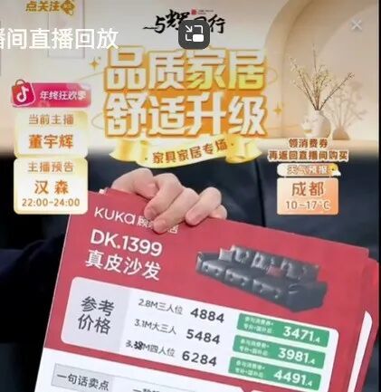 12月10日晚,據(jù)公開信息,董宇輝團(tuán)隊(duì)的家居專場直播5.5小時總銷售額達(dá)3.56億元,其中顧家家居(SH603816,股價30.73元,市值252.43億元)的一款真皮沙發(fā)單品成交額突破1億元,該沙發(fā)2.8米三人位優(yōu)惠后售價3471.4元。