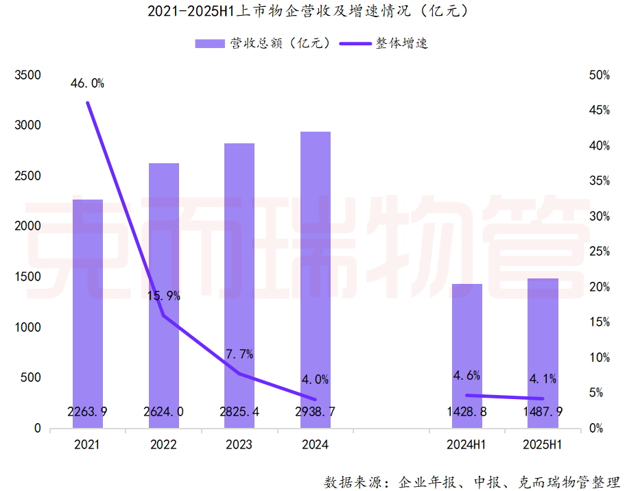 根據(jù)克而瑞物管數(shù)據(jù),2025年上半年,63家上市物業(yè)企業(yè)的營收總額增長至1487.9億元,同比增長4.1%,增速較去年同期下降了0.5個百分點;毛利潤均值為4.6億元,同比下降2.0%。