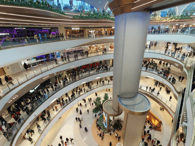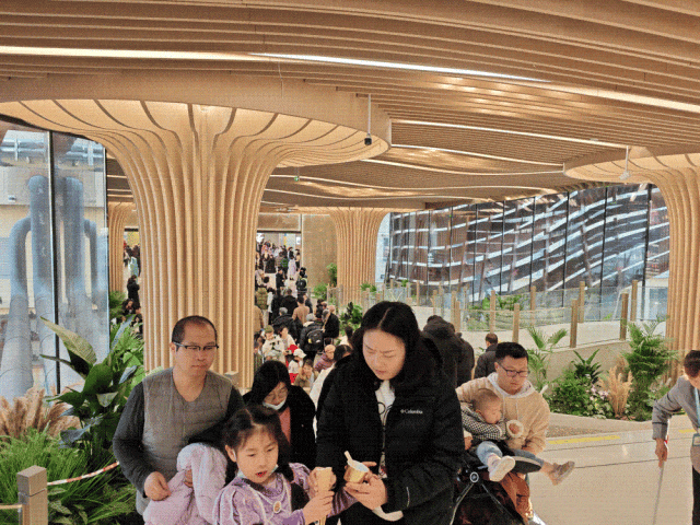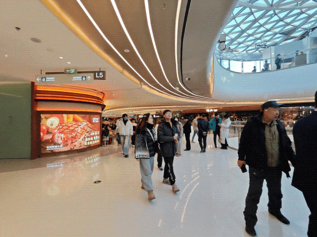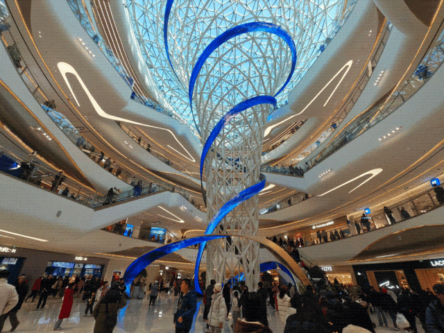 聯(lián)商網(wǎng)在現(xiàn)場(chǎng)看到,項(xiàng)目整體空間開(kāi)闊,規(guī)劃為地上6層、地下2層,并打造了“光影之境、懸水之境、穹宇之境”三大主題中庭。通過(guò)燈光、水景、獨(dú)特頂面造型等設(shè)計(jì)元素,將自然意象與科技感材料巧妙結(jié)合,形成了極具辨識(shí)度的公共空間,吸引了眾多顧客駐足打卡拍照。