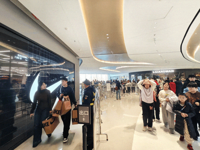 品牌布局以輕奢、潮流與運(yùn)動(dòng)業(yè)態(tài)為主線。COACH門(mén)店前有不少顧客排隊(duì)入場(chǎng),店外設(shè)置的巨型手袋裝置成為視覺(jué)焦點(diǎn);韓國(guó)潮牌We11done則通過(guò)標(biāo)志性小熊藝術(shù)裝置強(qiáng)化品牌形象,吸引消費(fèi)者停留拍照。